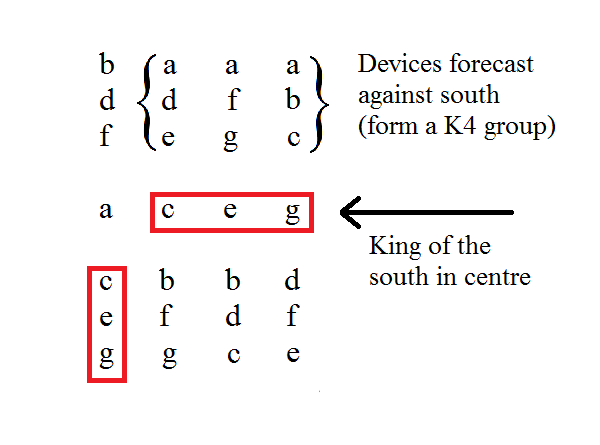 But the south does not stand because the devices against him fromo the north depend on a seven cycle. (By not "standing" we refer to the situation that the south is strictly limited to static triples (bows) rather than subgroups, (the "power of the arm").