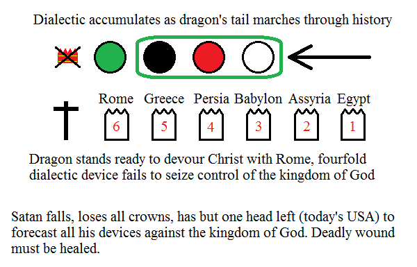 However it is not just simple like that. There is one horn or "strength" spent by the dragon in each kingdom, for when they pass away the authority is defeated and then completely gone with it. The three onto one device is employed by the dragon as His authority but physically the tail must accumulate with the sequence of kingdoms as described in the fall. The three-onto one device or the dialectic has been practiced by satan since Eden and continues today, however the record is the tail he leaves behind. This tail we see in each of Daniel's beasts as well as the first seals of revelation.